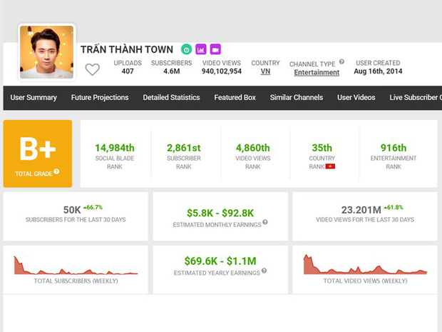Xếp thứ 2 trong danh sách là kênh Trấn Thành Town của MC Trấn Thành hiện có 4,6 triệu người đăng ký theo dõi và tổng số lượt xem video đạt hơn 938,7 triệu. Kênh này được ước tính trong vòng 1 năm có thu nhập từ 70.500 - 1,1 triệu USD, tương đương từ hơn 1,6 - 25,3 tỷ đồng.