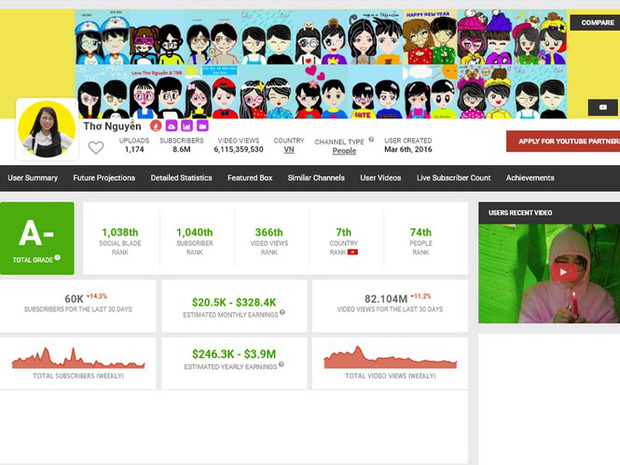 Một gương mặt nổi bật khác là Thơ Nguyễn với thu nhập khoảng 16 tỷ đồng trong năm 2020. Nhờ liên tục sáng tạo nội dung, Thơ Nguyễn đã thu về hơn 1,7 tỷ view trong năm 2020, trung bình đạt 144 triệu view/tháng. Và thành quả của lượng View khổng lồ này chính là mức doanh thu gần 700.000USD năm 2020, tương đương 16 tỷ đồng (mỗi tháng hơn 1,3 tỷ đồng), ngang ngửa nhiều đại gia hiện nay.