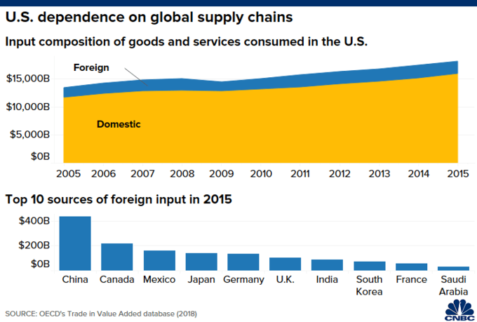Theo số liệu mới nhất năm 2015, nguyên liệu đầu vào nước ngoài chiếm 12,2% (tương đương 2.200 tỷ USD) tổng hàng hóa và dịch vụ được tiêu thụ tại Mỹ. Trung Quốc là nước cung cấp số linh kiện đầu vào lớn nhất cho Mỹ