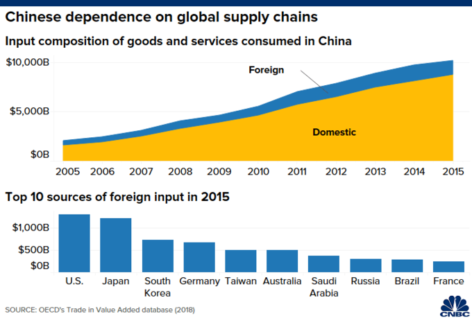 Trong khi đó, tại Trung Quốc, các nhà cung cấp nước ngoài đóng góp 14,2% (tương đương 1.400 tỷ USD) tổng hàng hóa và dịch vụ được tiêu thụ tại đây năm 2015. Mỹ cũng là nước cung cấp nguyên liệu nước ngoài lớn nhất cho Trung Quốc.