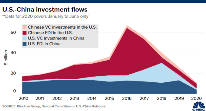 Số liệu của Rhodium Group cho thấy trong 3 năm qua, tổng giá trị đầu tư trực tiếp (FDI) và đầu tư mạo hiểm giữa hai nước đã giảm dần. "Xu hướng rõ rệt nhất là Trung Quốc giảm thâu tóm tài sản công nghệ Mỹ", Rhodium Group cho biết trong báo cáo tháng trước.