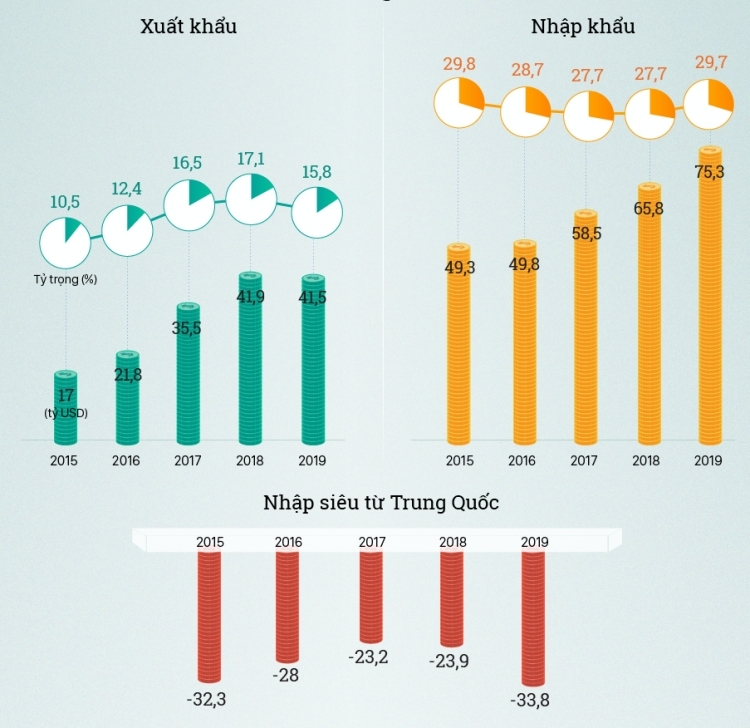 Năm 2019, Việt Nam nhập siêu gần 34 tỷ USD từ Trung Quốc, đứng đầu là điện thoại và linh kiện điện tử, nguyên phụ liệu dệt may, da giày. Với việc là một trong những nước phụ thuộc lớn vào nguyên liệu đầu vào từ Trung Quốc, tác động của dịch với hoạt động sản xuất của Việt Nam không nhỏ. Theo khảo sát của Ban nghiên cứu phát triển kinh tế tư nhân (Ban IV), nhiều doanh nghiệp cho biết chỉ có thể "cầm cự" được thêm một tuần trước tình cảnh khó khăn về nguyên liệu sản xuất và khâu vận chuyển qua biên giới.