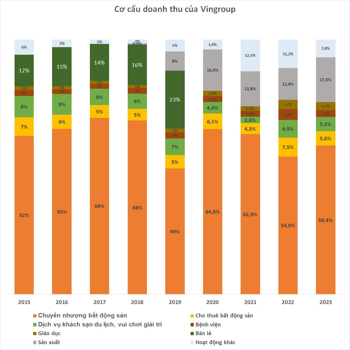Trong bối cảnh cả chuyển nhượng bất động sản lẫn sản xuất đều tăng doanh thu, thì tỷ trọng từ cho thuê bất động sản, nghỉ dưỡng, bệnh viện và giáo dục đều giảm dù năm qua cùng lập đỉnh mới về doanh thu.