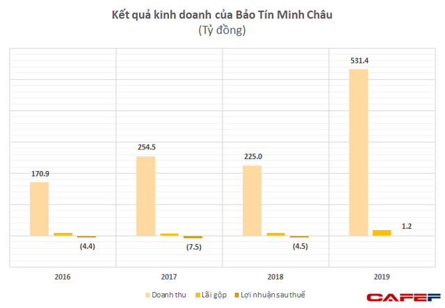 Bảo Tín Minh Châu cũng không tránh khỏi điều này, liên tiếp từ 2016 đến 2018 công ty lỗ từ 4 – 7 tỷ đồng. Năm 2019, Bảo Tín Minh Châu có lãi nhưng không đáng kể, chỉ 1,2 tỷ đồng.