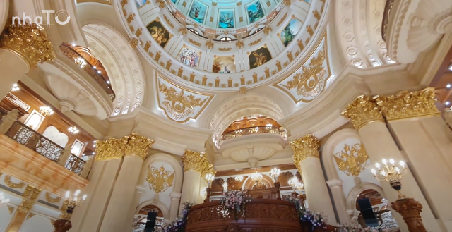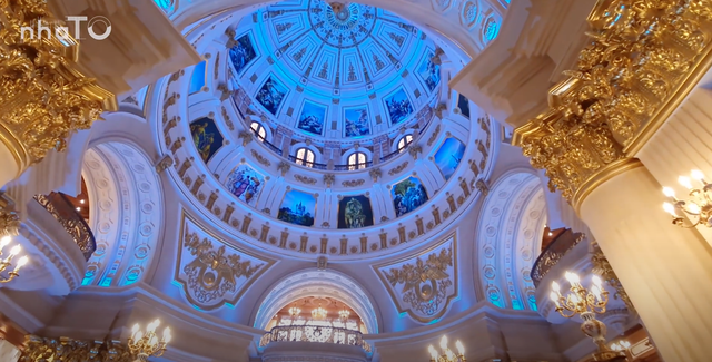 Khám phá không gian bên trong công trình, chắc hẳn nhiều người sẽ có cảm giác như đang lạc vào những cung điện tại châu Âu với kiến trúc, màu sơn và hệ mái vòm đặc trưng. Bốn phía của mái vòm thiết kế theo hình quốc huy nước Nga, bên trên là vô số bức tranh sơn dầu thời Phục hưng. Ngoài ra, toàn bộ hoạ tiết đều được dát vàng 24k.