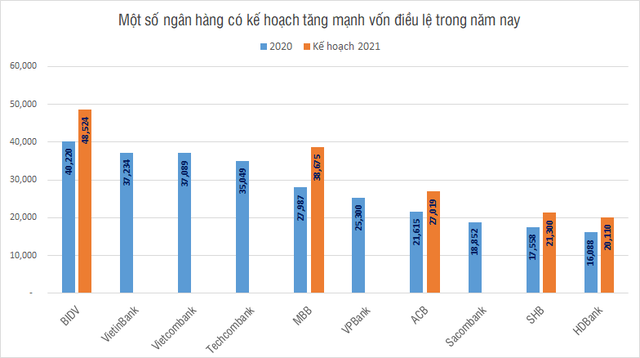 Ngân hàng có vốn điều lệ lớn nhất hiện nay là BIDV với hơn 40.200 tỷ đồng cũng có kế hoạch tăng vốn. Tại ĐHĐCĐ thường niên vừa qua, cổ đông ngân hàng đã thông qua phương án tăng vốn điều lệ lên hơn 48.500 tỷ đồng (tức tăng 20,6%) trong giai đoạn 2021-2022. Phương án tăng vốn bao gồm việc phát hành 207,3 triệu cổ phiếu để trả cổ tức năm 2019 (tỷ lệ 5,2%), phát hành 281,5 triệu cổ phiếu để trả cổ tức năm 2020 (tỷ lệ 7%) và phát hành thêm 341,5 triệu cổ phần mới bằng hình thức chào bán ra công chúng hoặc chào bán riêng lẻ.