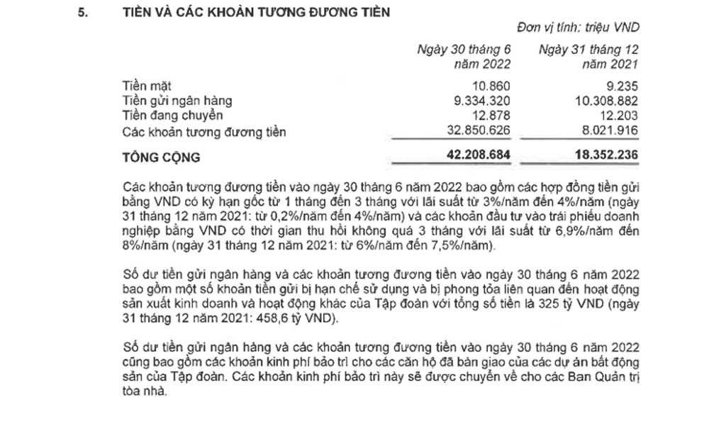 Trong đó, tiền mặt là 1.919 tỷ đồng, tiền gửi ngân hàng là hơn 3.500 tỷ đồng. Các khoản tương đương tiền là gần 26,3 nghìn tỷ đồng. Các khoản tương đương tiền vào ngày 30/6/2022, bao gồm các khoản đầu tư và các khoản tiền gửi bằng VND tại các ngân hàng thương mại có kỳ hạn từ 1 đến 3 tháng, hưởng lãi suất từ 3% đến 8%/năm.