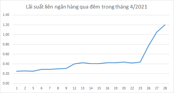 05/05/2021 22:24Lãi suất liên ngân hàng bất ngờ tăng mạnh, gấp 3-5 lần so với đầu tháng 4