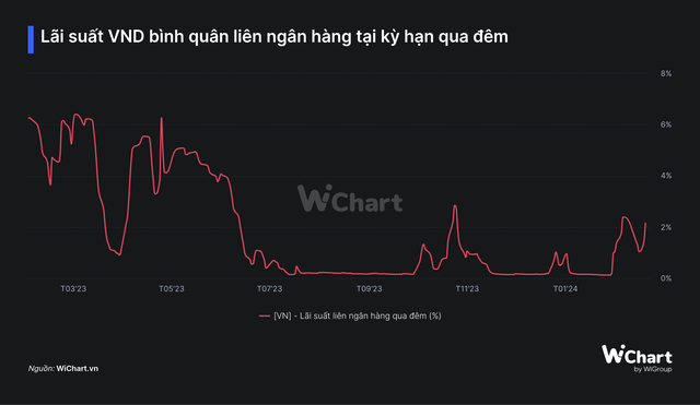 Tuy nhiên, sau khi tăng trưởng tín dụng cao đột biến trong tháng 12/2023, lãi suất liên ngân có xu hướng tăng trở lại, đặc biệt là giai đoạn trước và sau Tết nguyên Đán.