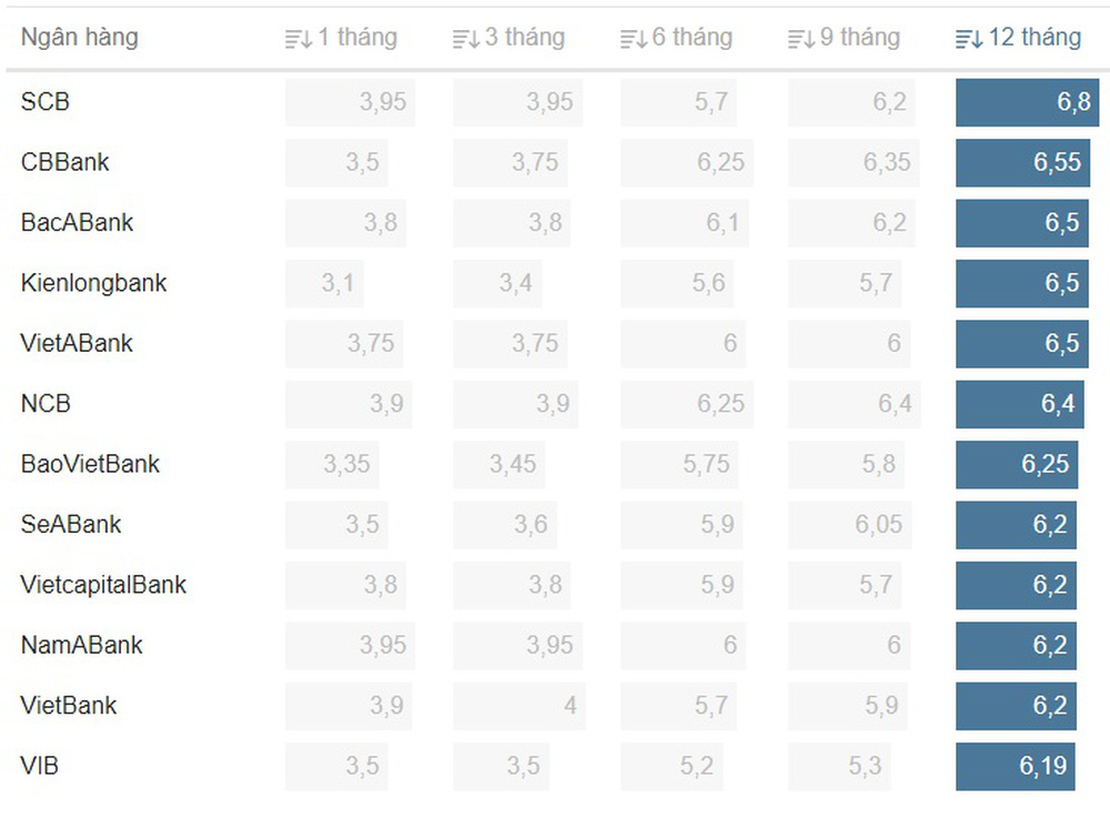 Kỳ hạn 12 tháng SCB áp dụng mức lãi suất 6,8%/năm với điều kiện số tiền gửi từ 500 tỷ đồng trở lên. CBBank đạt 6,55%, VietABank, Bac A Bank và Kienlongbank có lãi suất tiền gửi 6,5%/năm, NCB 6,4%...