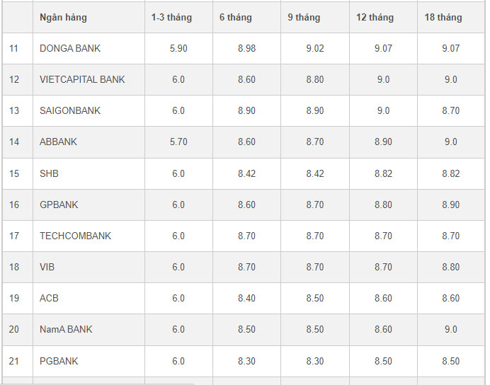 Trong khi đó, NamA Bank áp dụng lãi suất cố định với các kỳ hạn, ngoại trừ kỳ hạn 12 tháng áp dụng lãi suất 8,5% đối với khoản tiền gửi dưới 500 tỷ đồng. Từ 500 tỷ đồng trở lên, lãi suất sẽ áp dụng mức 10,7%/năm.