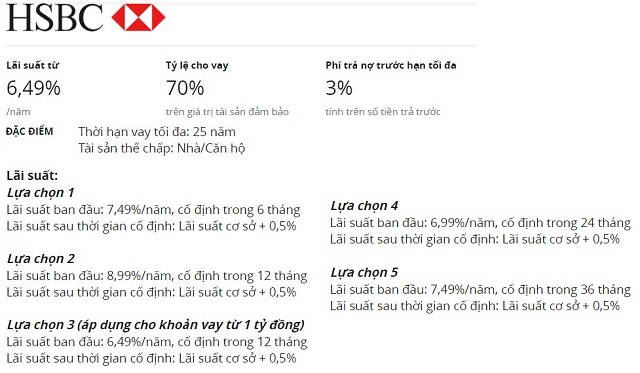 Ngoài ra tại mỗi ngân hàng cũng sẽ có các lựa chọn khác cho người vay. Khách hàng HSBC sẽ có 5 lựa chọn với mức lãi suất ban đầu dao động 6,49%-8,99%, trong thời gian cố định dao động 12-36 tháng. Sau thời gian này, lãi suất sẽ tính bằng lãi suất cơ sở cộng 0,5%. Phí trả nợ trước hạn dao động 1-3% tùy vào thời gian trong khoảng 1-3 năm.