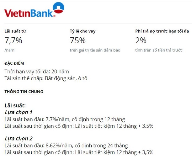 Phí trả nợ trước hạn tại Vietcombank là 0,5-1% trong 1-2 năm đầu và miễn phí trả nợ trước hạn từ năm thứ 3. Trong khi đó, tại VietinBank, khoản phí này dao động 1-2% trong 1-5 năm. Thời hạn vay tối đa tại 2 ngân hàng lần lượt 15 năm và 20 năm.