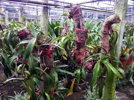 Thông thường, phong lan được các nhà vườn ký gửi trên gỗ nhãn - loại gỗ thích hợp với trồng phong lan. Nhiều nhà vườn ở Hưng Yên năm nay có “sáng kiến” khác lạ, đó là sử dụng gốc tre - củ tre để ký gửi lan. |