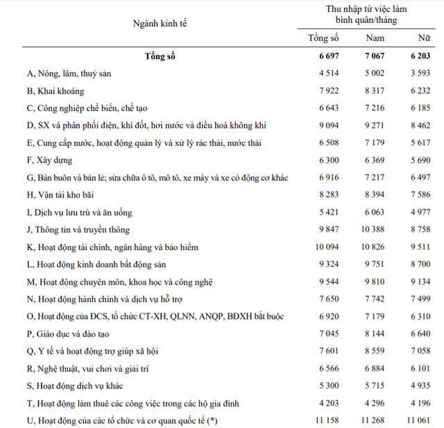 Một số ngành có mức thu nhập bình quân tháng khá cao so với mặt bằng chung như hoạt động tài chính, ngân hàng và bảo hiểm (9,5-10,8 triệu đồng); thông tin và truyền thông (8,7-10,3 triệu đồng); hoạt động kinh doanh bất động sản (8,7-9,7 triệu đồng); hoạt động chuyên môn, khoa học và công nghệ (9,1-9,8 triệu đồng)...