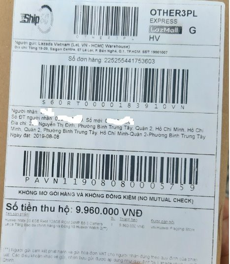 Ngày 9/8/2019, anh nhận hàng, ngoài vỏ kiện hàng ghi rõ người gửi là từ Lazada Việt Nam, tên hàng hóa trên nhãn có ghi đủ cả điện thoại và đồng hồ khuyến mãi như đơn đặt hàng. Nhưng khi anh mở hộp ra thì không có hàng khuyến mãi tặng kèm là chiếc đồng hồ Huawei Watch 2 6GB trị giá 6,4 triệu đồng.