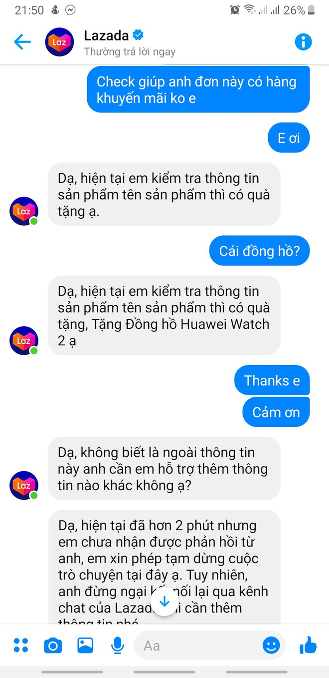 Cho đến ngày 13/8/2019, có đại diện của Lazada gọi điện cho anh thông báo: “sản phẩm không có hàng khuyến mãi tặng kèm và đề nghị tặng Voucher 100.000 đồng” nhưng anh không đồng ý.