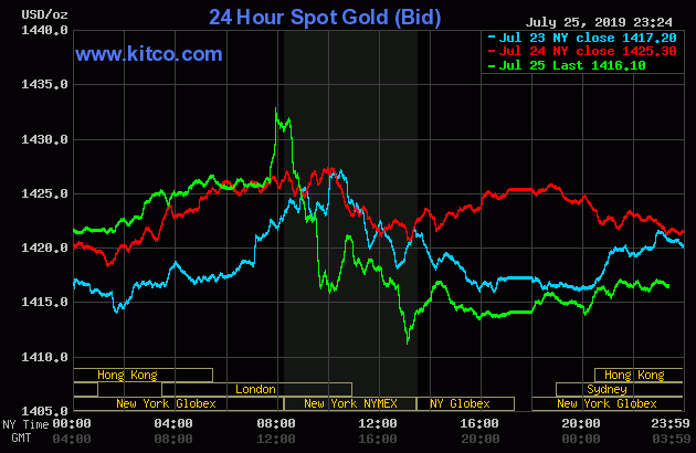 Cùng thời điểm, giá vàng giao ngay trên sàn Kitco đang giao dịch ở mức 1.416,1 USD/ounce, giảm 9,2USD, tương đương 0,65% so với chốt phiên trước.