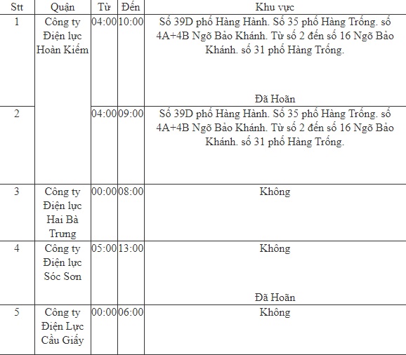 - Công ty Điện lực Hoàn Kiếm; thay vì cắt điện từ 04-10h, thì sẽ được mở lại sớm hơn 1 giờ đồng hồ (04-09h); Số 39D phố Hàng Hành. Số 35 phố Hàng Trống. số 4A+4B Ngõ Bảo Khánh. Từ số 2 đến số 16 Ngõ Bảo Khánh. số 31 phố Hàng Trống.