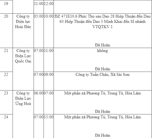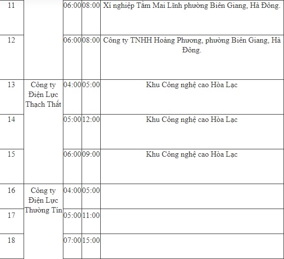 - Công ty Điện Lực Thạch Thất: 04-12h tại Khu Công nghệ cao Hòa Lạc.
