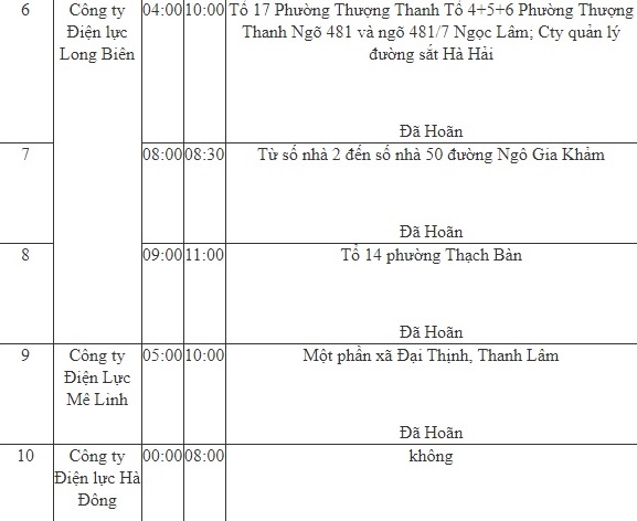 - Công ty Điện lực Hà Đông; từ 06-08h cắt điện tại Xí nghiệp Tằm Mai Lĩnh phường Biên Giang, Hà Đông và Công ty TNHH Hoàng Phương, phường Biên Giang, Hà Đông.