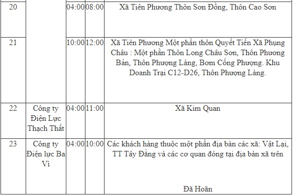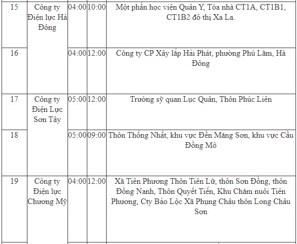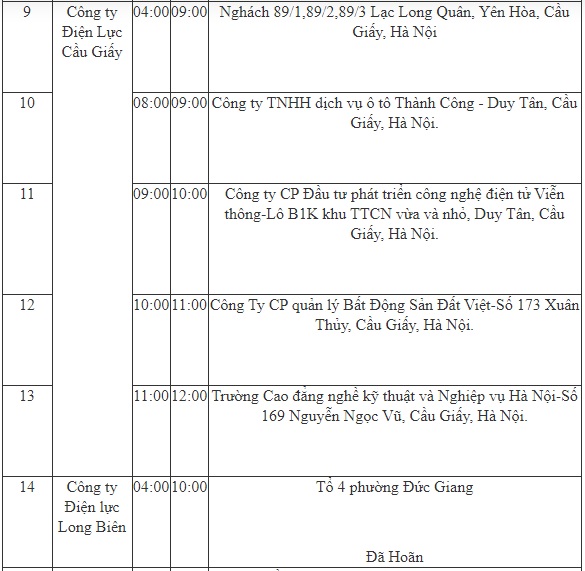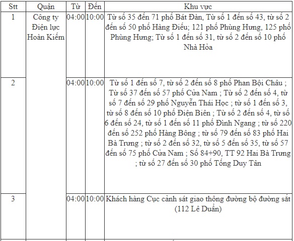 - Công ty Điện lực Hoàn Kiếm; từ 04-10h;