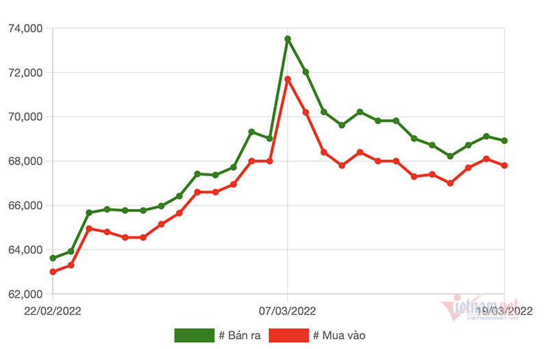 Các phiên sau đó, giá vàng trong nước đã rời mốc 69 triệu đồng/lượng ở chiều bán ra. Kết thúc phiên giao dịch hôm qua, giá vàng miếng 9999 tại SJC Hà Nội là 67,8 triệu đồng/lượng (mua vào)- 68,92 triệu đồng/lượng (bán ra). SJC TP.HCM niêm yết ở mức 67,8 triệu đồng/lượng (mua vào) và 68,9 triệu đồng/lượng (bán ra).