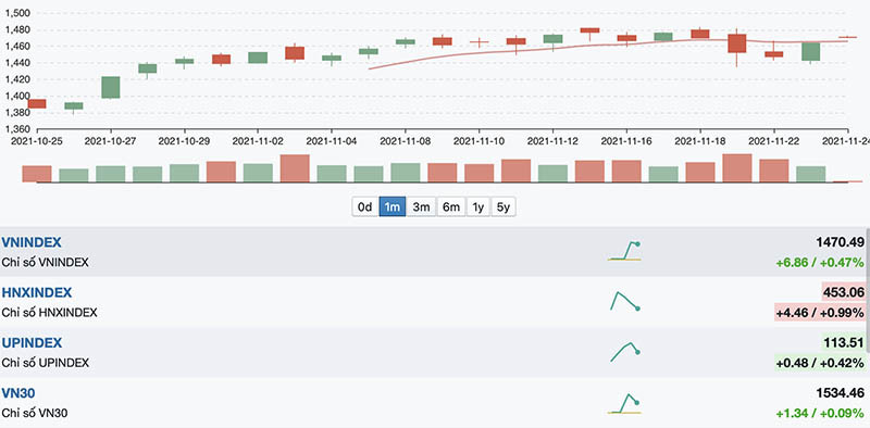Kết thúc phiên giao dịch ngày 23/11, VN-Index tăng 16,38 điểm (1,13%) lên 1.463,63 điểm. HNX-Index tăng 3,98 điểm (0,9%) lên 448,6 điểm. UPCoM-Index tăng 1,07 điểm (0,96%) lên 113,03 điểm.