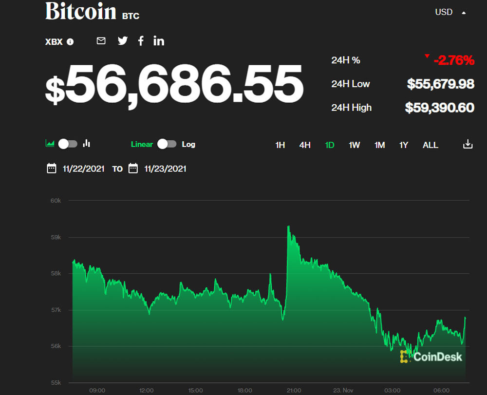 Theo dữ liệu cập nhật từ CoinDesk vào lúc 7h30' sáng nay (23/11, theo giờ Việt Nam), giá Bitcoin được giao dịch ở mức 56.686,55 USD, giảm 2,76% so với ngày hôm qua. Trong 24 giờ gần nhất, giá Bitcoin thời điểm cao nhất đạt 59.390,6 USD, thấp nhất ở mức 55.679,98 USD.
