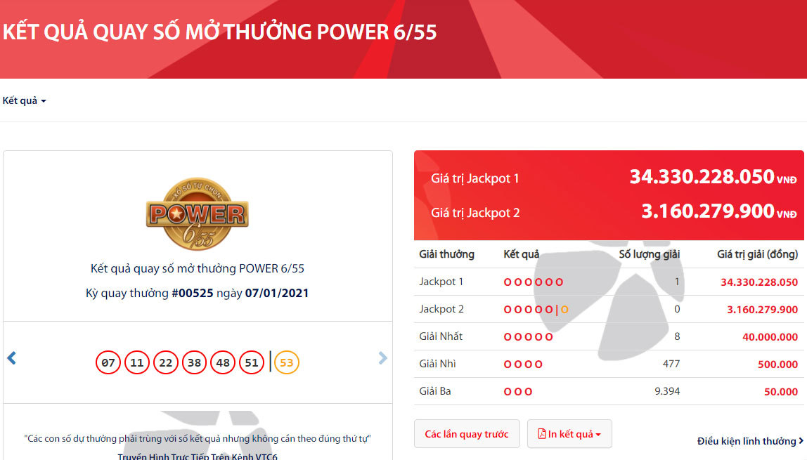 Theo thông báo của Công ty Xổ số Điện toán Việt Nam (Vietlott), trong kỳ quay số mở thưởng lần thứ 525 của loại hình xổ số tự chọn Power 6/55 diễn ra vào tối nay (7/1), Vietlott xác nhận đã có 1 tấm vé trúng giải Jackpot 1 trị giá 34.330.228.050 đồng.