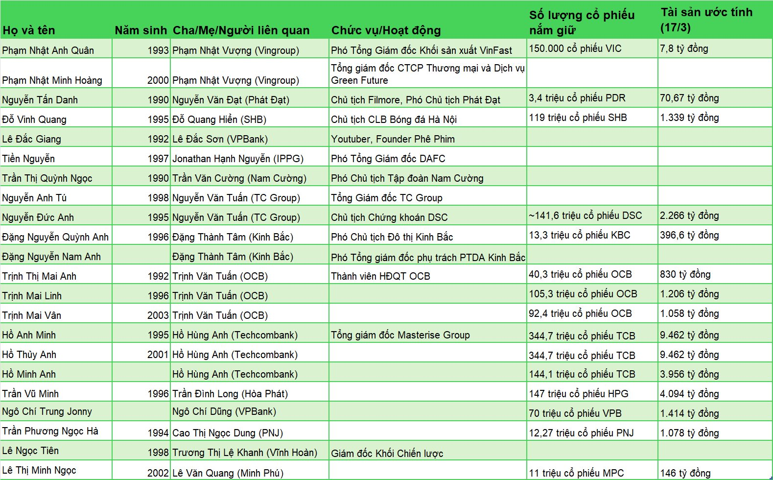 Ví dụ như tỷ phú Phạm Nhật Vượng, con trai của ông là Phạm Nhật Anh Quân chỉ đang sở hữu 150.000 cổ phiếu VIC, có giá trị khoảng 7,8 tỷ đồng, còn em trai Phạm Nhật Minh Hoàng thì không sở hữu cổ phiếu nào.