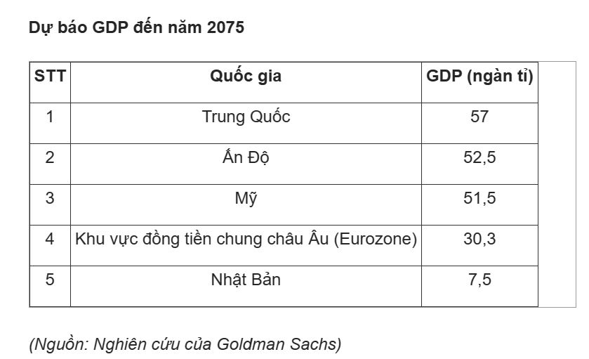 "Ấn Độ đã sẵn sàng không chỉ vượt qua Nhật Bản và Đức mà còn cả Mỹ để trở thành nền kinh tế lớn thứ hai thế giới vào năm 2075" – CNBC dẫn báo cáo mới nhất của tập đoàn tài chính Mỹ Goldman Sachs.