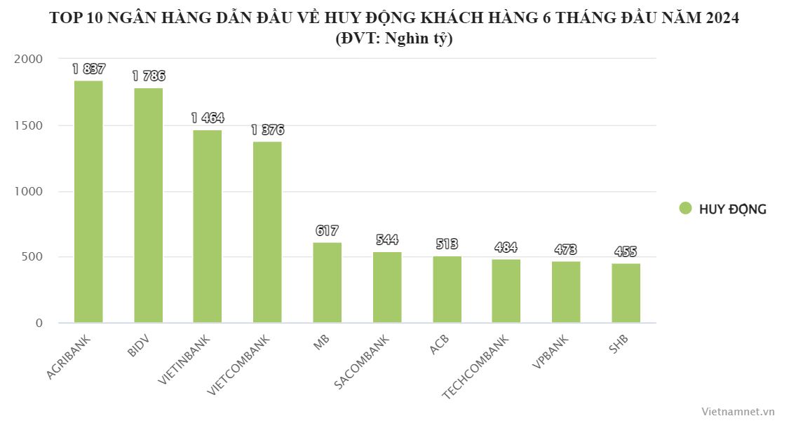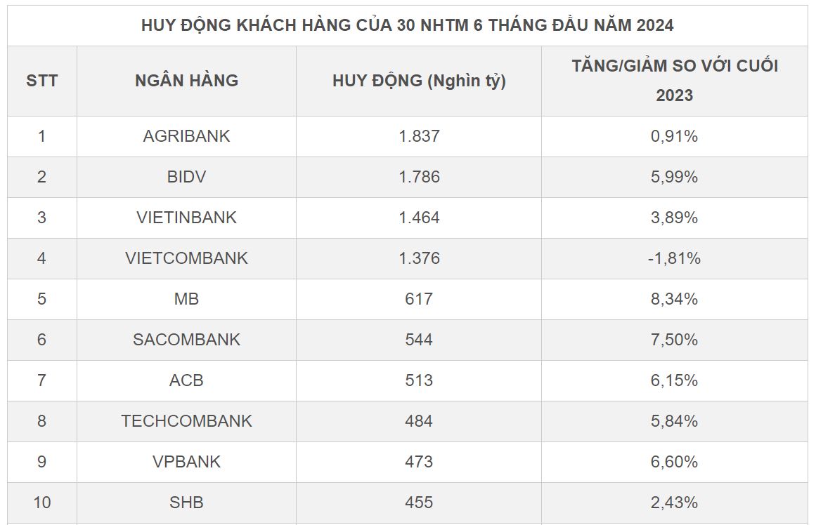 4 ngân hàng thương mại nhà nước (Agribank, VietinBank, Vietcombank, BIDV) dẫn đầu thị trường về huy động vốn. Tổng lượng tiền gửi tính đến 30/6 đạt 6,36 triệu tỷ đồng. Tổng cho vay và huy động của nhóm này chiếm 52% tổng dư nợ cho vay và huy động của cả 30 ngân hàng cộng lại.