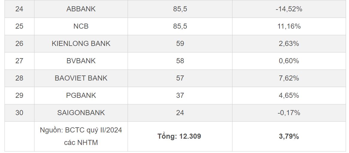 Theo báo cáo tài chính riêng lẻ quý II/2024 của 30 ngân hàng thương mại, tăng trưởng tín dụng trong 6 tháng đầu năm của các ngân hàng này đạt 7,21%, với tổng lượng vốn cho vay đạt 12,328 triệu tỷ đồng.