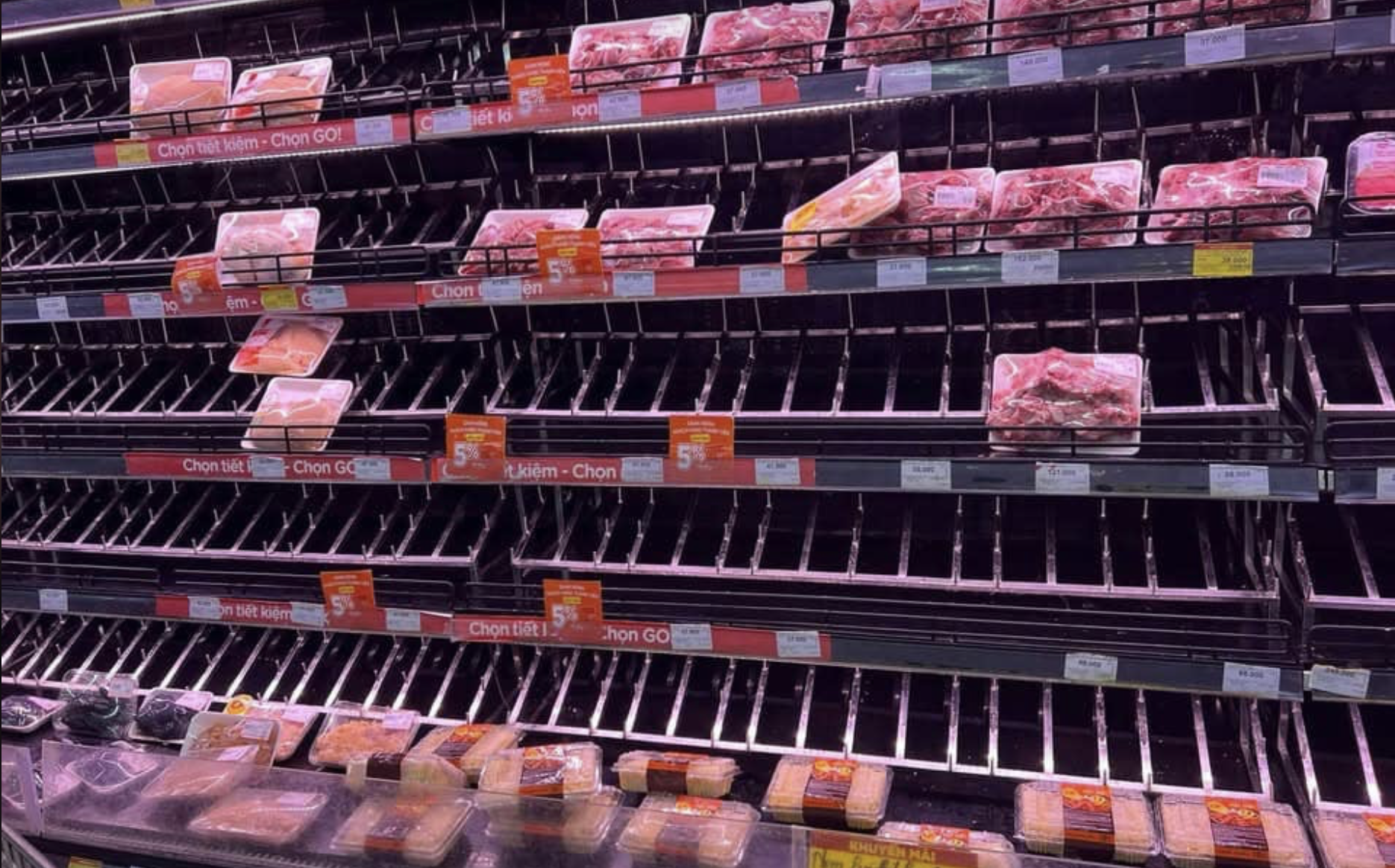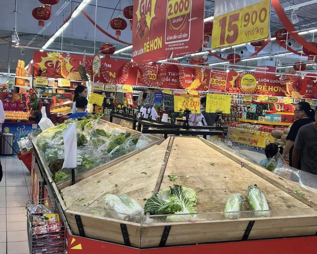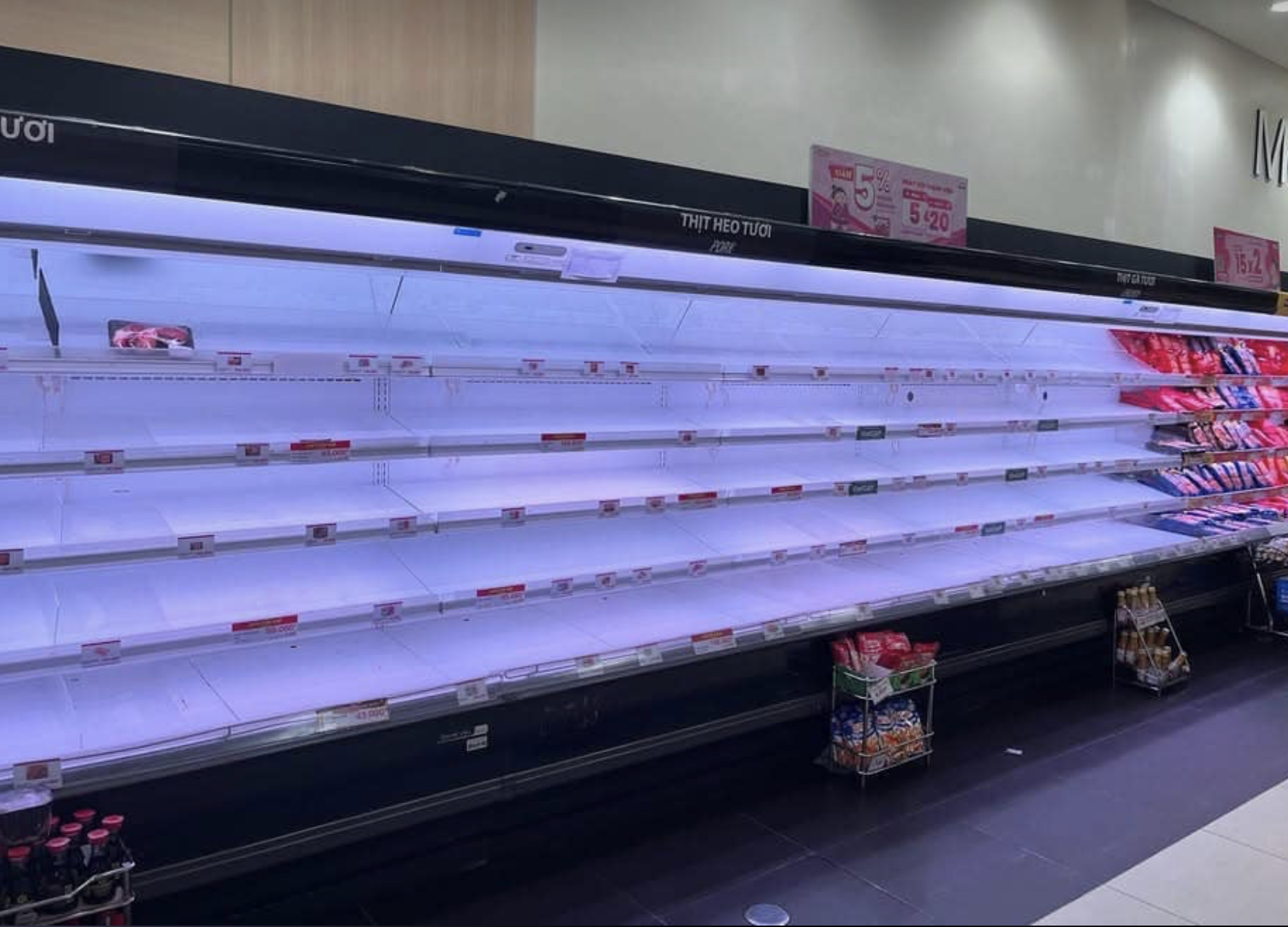 Trong khi, tại các hệ thống siêu thị lớn ở Hà Nội như AEON, WinMart,… lượng khách bắt đầu đổ dồn về đây mua các loại lương thực, thực phẩm từ tối qua. Ngay lập tức, khu vực quầy kệ bày bán thịt lợn, rau xanh của nhiều siêu thị đã trống trơn.
