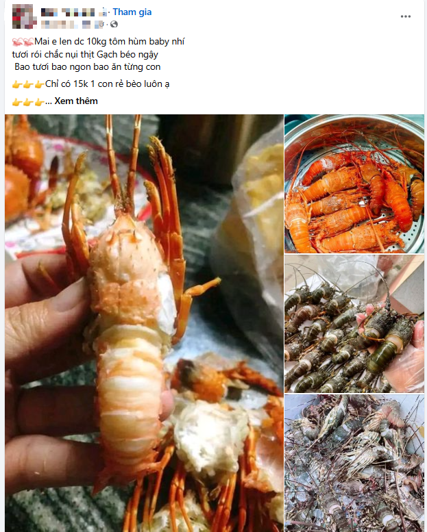 Cụ thể, trên các trang mạng xã hội - chợ online, tôm hùm đang được bán với mức giá gây sốc, chỉ từ 15.000 - 40.000 đồng/con. Các đầu mối bán hàng kèm cam kết "bao tươi, chắc thịt", "bao ăn đến từng con" và cho phép khách hàng kiểm tra hàng trước khi thanh toán.