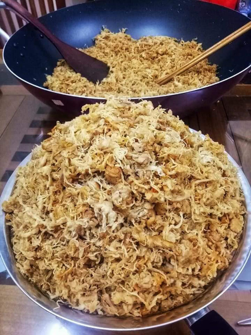 “Mình cũng thử làm ruốc mỡ vì nghĩ khá dễ, nhưng khi ra thành phẩm sợi ruốc vẫn bị khô. Không biết họ có bí quyết gì mà sợi ruốc giã thô, xao rồi vẫn giữ được độ mềm ngọt”, chị thắc mắc.