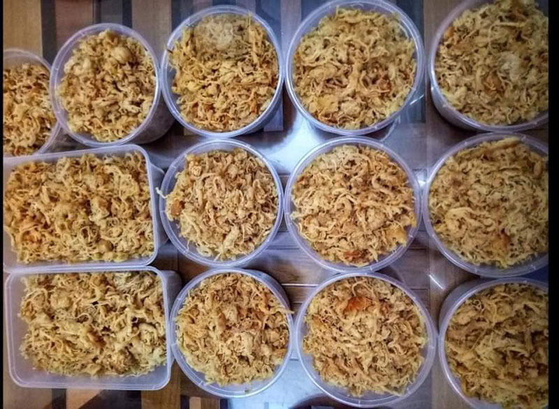 “Để ruốc ngon, mình không bao giờ cho vào máy xay để xay thịt cả mà phải cho vào cối giã nhỏ thành sợi. Giã sao cho vừa phải, không được giã nhỏ và tơi quá. Sau bước này, mình rang săn khô cùng mỡ phần. Muốn ruốc giữ được độ mềm, ngọt thì không rang kỹ quá, chỉ xém thơm thôi kẻo ruốc khô cứng. Để ruốc thật nguội rồi mới đóng gói hay cho vào lọ kín”, chị Quý kể.