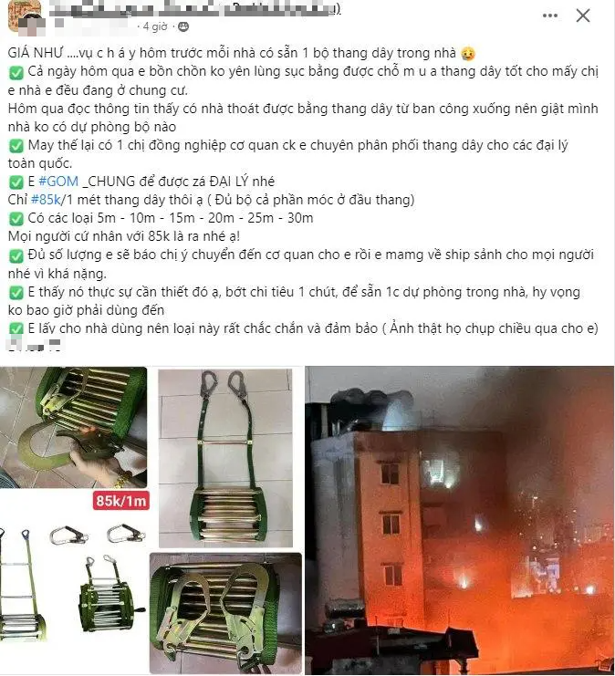 Theo chị A. (một cư dân hiện đang sinh sống tại chung cư mini khác ở Hà Nội) cho biết, ngay sau khi vụ cháy xảy ra, chị A. vô cùng sợ hãi và tìm mua thang dây ngay lập tức. Cũng sống trong chung cư mini có nhiều nét thiết kế tương đồng với toà chung cư mini bị cháy ở phố Khương Hạ (quận Thanh Xuân, Hà Nội), chị A. càng lo lắng hơn và đưa ra quyết định mua thang dây nhanh chóng hơn.