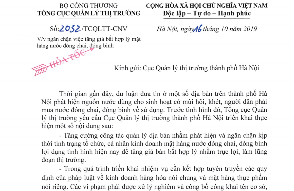 Cụ thể, Tổng cục Quản lý thị trường yêu cầu Cục Quản lý thị trường thành phố Hà Nội tăng cường công tác quản lý địa bàn nhằm phát hiện và ngăn chặn kịp thời tình trạng tổ chức, cá nhân kinh doanh mặt hàng nước đóng chai, đóng bình lợi dụng tình hình hiện nay để tăng giá bán bất hợp lý nhằm trục lợi, lũng đoạn thị trường.