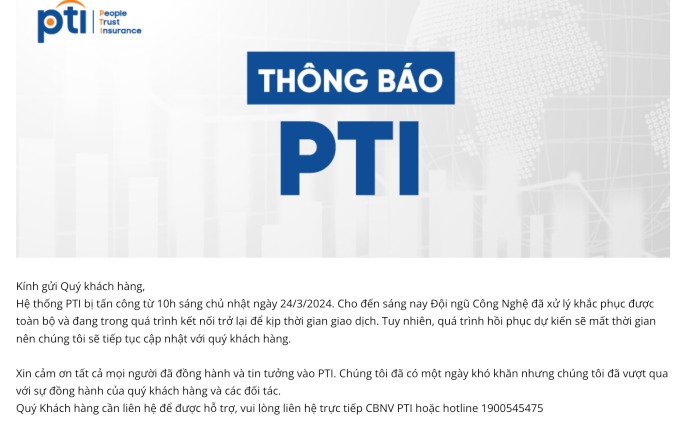 "Hệ thống PTI bị tấn công từ 10h ngày 24/3/2024. Đến sáng nay đội ngũ công nghệ đã khắc phục toàn bộ và đang trong quá trình kết nối trở lại", website Tổng công ty Bảo hiểm Bưu Điện (PTI) đăng thông báo với nội dung tương tự của VNDirect.