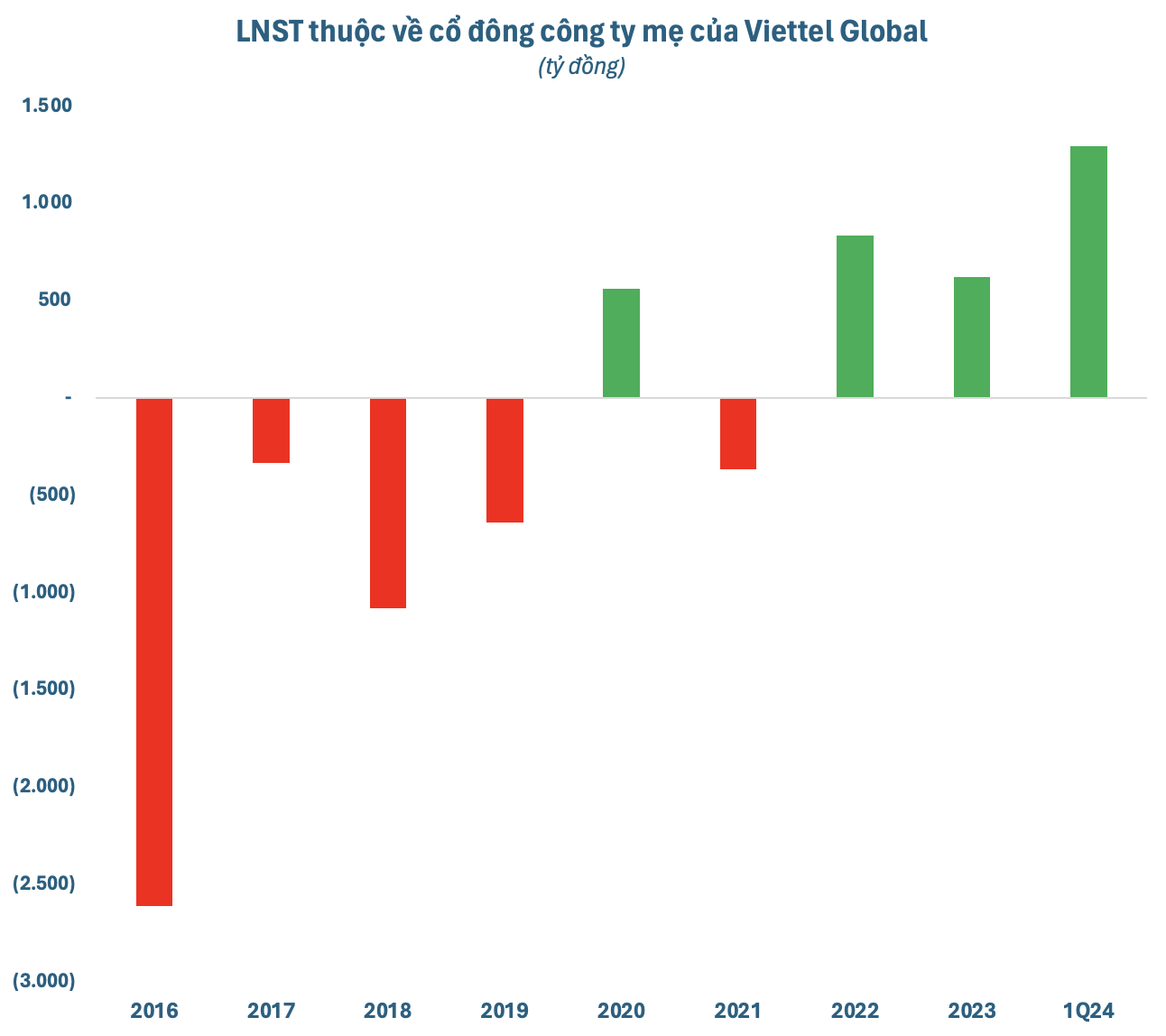 Tình hình đã có những chuyển biến tích cực khi Viettel Global ghi nhận lợi nhuận sau thuế thuộc về cổ đông công ty mẹ dương 2 năm liên tiếp 2022-2023. Riêng quý đầu năm 2024, LNST thuộc cổ đông công ty mẹ của tổng công ty đạt 1.296 tỷ đồng, gấp 3,5 lần cùng kỳ và là mức cao nhất kể từ quý 3/2022.