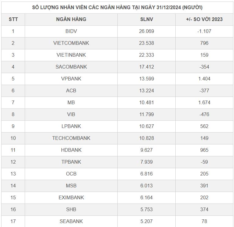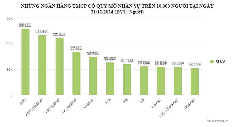 Tiếp theo, các ngân hàng: Sacombank (17.000 người), VPBank (15.000 người), ACB (12.800 người), MB (12.155 người), VIB (11.300 người), LPBank (11.200 người), Techcombank (11.000 người) và HDBank (10.600 người) là những nhà băng có quy mô nhân sự trên 10.000 người.