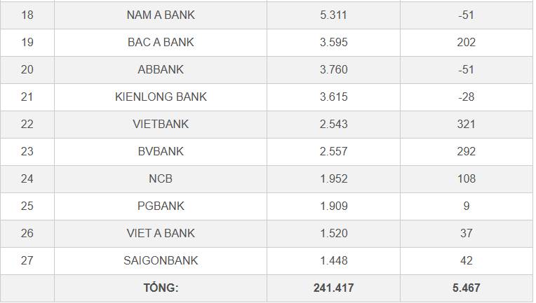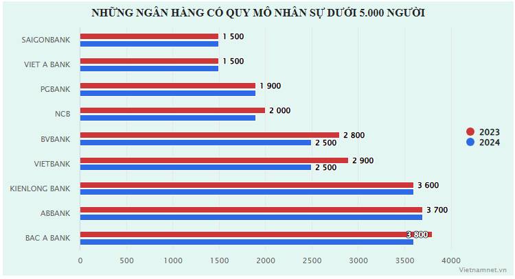 Nhóm các ngân hàng có số lượng CBNV dưới 5.000 người còn bao gồm: NCB (2.060 người), BVBank (2.849 người), VietBank (2.864 người), KienlongBank (3.587 người), ABBank (3.700 người) và Bac A Bank (3.800 người).