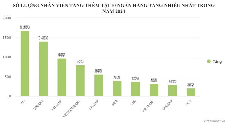 Hầu hết ngân hàng đều ghi nhận số lượng nhân sự tăng so với đầu năm, trong đó hai nhà băng tăng mạnh nhất là MB tăng 1.674 người, lên 12.155 người và VPBank tăng 1.404 người, lên 15.003 người.