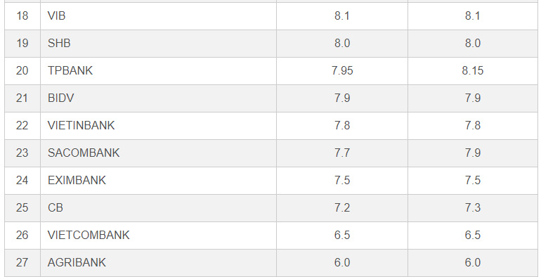 Ngân hàng TMCP Tiên Phong (TPBank) giảm lãi suất kỳ hạn 6-9 tháng lần lượt từ 7,95-8,15% xuống 7,8-8%/năm. Tuy nhiên, ngân hàng này áp dụng phương thức tính lãi tiền gửi kỳ hạn 6 tháng có thể lên đến 8,2%/năm nếu quay vòng kỳ 2, tương đương lãi suất tiền gửi kỳ hạn 12 tháng, mức cao nhất tại TPBank.