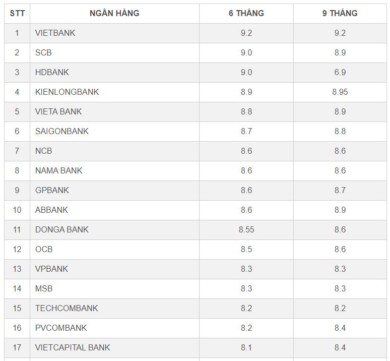 Tính đến thời điểm hiện tại (13/3), dù vừa tiếp tục hạ lãi suất huy động online các kỳ hạn từ 6 tháng trở lên, cụ thể từ 9,5% xuống 9,2%/năm, nhưng Ngân hàng TMCP Việt Nam Thương Tín (VietBank) vẫn đang dẫn đầu thị trường về mức lãi suất. Lãi suất các kỳ hạn từ 6 tháng trở lên được VietBank áp dụng chung mức 9,2%/năm.
