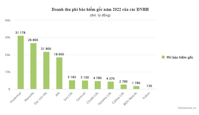 Xét về doanh thu phí bảo hiểm gốc, Prudential Việt Nam dẫn đầu với 31.179 tỷ đồng. Đứng thứ hai là Manulife Việt Nam đạt 26.803 tỷ đồng. Tiếp đến là Dai-ichi Life 21.800 tỷ đồng và AIA 18.600 tỷ đồng.