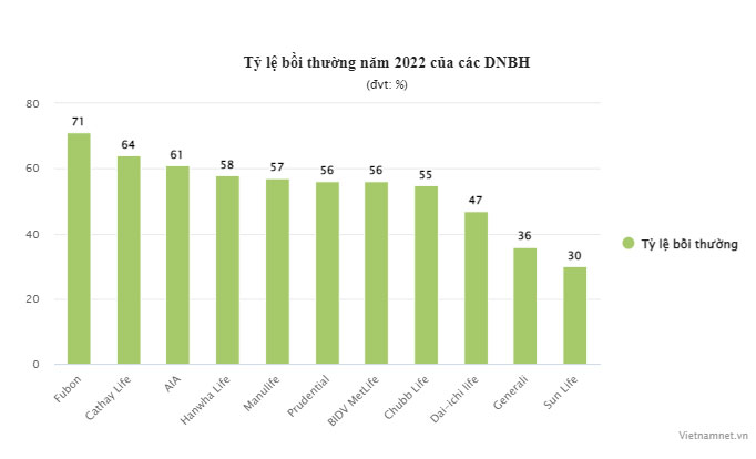 Đứng sau Fubon Việt Nam về tỷ lệ bồi thường lần lượt gồm: Cathay Life (64%), AIA (61%), Hanwha Life (58%), Manulife (57%), BIDV Metlife (56%), Prudential (56%), Chubb Life (55%), Dai-ichi Life (47%), Generali (36%), và Sun Life (30%).