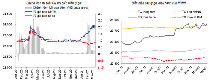 Về diễn biến trên thị trường ngoại hối, trong phiên họp tháng 3 của Cục dự trữ Liên bang Mỹ (FED) có kết quả không nhiều bất ngờ khi FED giữ quan điểm duy trì tốc độ nới lỏng hiện tại (lãi suất 0-0,25% và chưa tăng trở lại cho đến hết 2023) nhưng nâng dự báo tăng trưởng kinh tế Mỹ từ 4,2% lên 6,5% trong năm 2021, lạm phát có thể chạm 2,4% vào cuối 2021 và hạ nhiệt vào 2022.